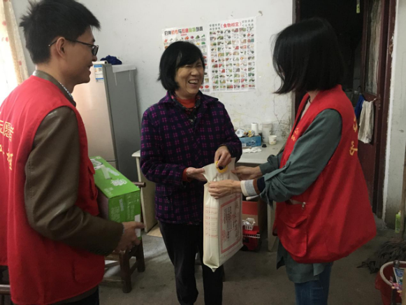 志愿者开展走访关爱老年人活动,上门为居民送去慰问物资(邓超 摄)