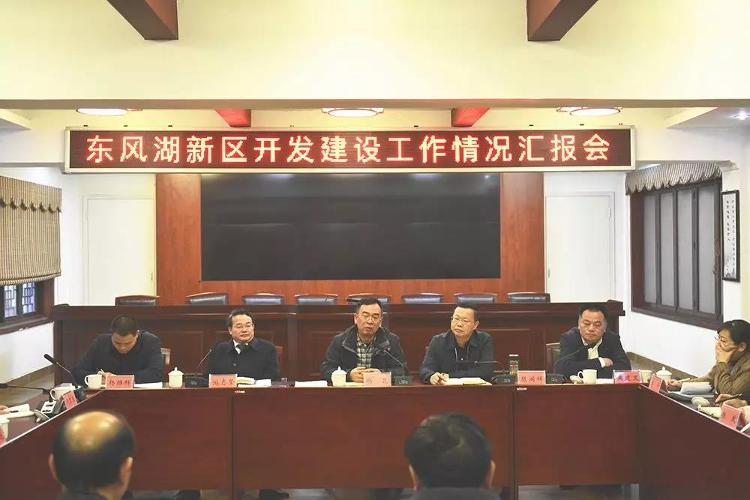 1月24日下午,区委书记陈阁辉主持召开东风湖新区开发建设工作情况汇报会,总结2018年度东风湖新区建设情况,安排部署今年新区建设重点工作。副市长杨昆出席,市城投集团董事长游志坚,区委副书记、区长黄建文,市水建投总经理杨雄辉,区领导李峰、白铭科、严石龙参加。