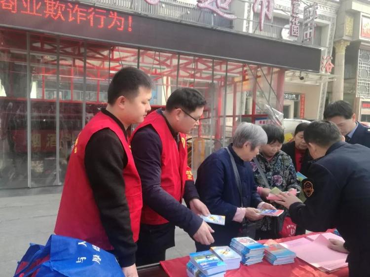 >>>3月15日上午,金鹗山街道安监办、综治中心联合食药、工商、司法等部门,分别在南湖名门世家、金鹗山公园东门开展以“加大市场监管力度,打击侵害权益行为”“推广公共法律服务,拓宽居民维权途径”等为主题的普法宣传活动。