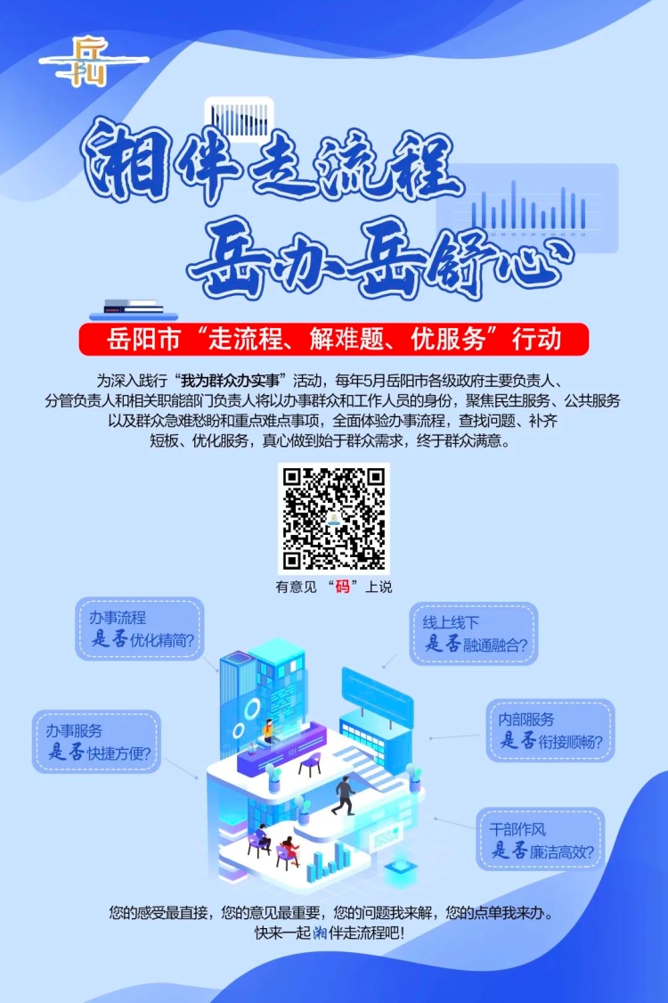 据了解,我市"走流程、解难题、优服务" 行动将采取集中走和常态走相结合的方式,每年5月集中开展,建立常态流程机制,真心做到始于群众需求,终于群众满意。同时,岳阳还推出“湘伴走流程,岳办岳舒心”网络专栏,群众通过扫描二维码即可线上反映问题、提出意见,就具体事项“码”上点单还可邀请相关责任人陪办、代办。对发现的问题、反馈的问题,聚焦关键环节,大力攻坚破难,进一步疏通服务堵点、攻坚改革难点、化解办事痛点,在推行一次办一起办、网上办掌上办、帮代办上门办、免证办容缺办、就近办自助办上,创造更多岳阳品牌,打造更多岳阳特色,让政务服务更加畅通畅快、舒心暖心,全面提升政务服务标准化、规范化、便利化水平,持续优化营商环境,让群众真切感受到活动带来的新变化、新体验、新服务,不断增强群众的获得感、幸福感。