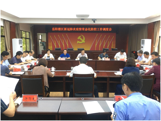 7月21日上午,区委书记陈阁辉主持召开全区新冠肺炎疫情常态化防控工作调度会。他强调,岳阳楼区作为中心城区,疫情防控的责任更重、压力更大、周期更长,必须严格标准要求,持之以恒推进,不断巩固扩大来之不易的防控成果,夺取最后胜利。区领导李峰、徐平、王智勇、李尧瑶参加。