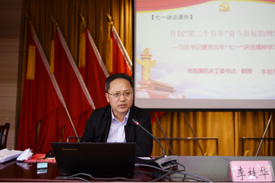 会议邀请市直机关工委书记李桂华作题为《开创“第二个百年”奋斗目标的纲领性文献》的宣讲报告。李桂华紧紧围绕习近平总书记“七一”重要讲话的时代背景和重要意义、伟大建党精神、落实“九个必须”的根本要求、高质量党建引领岳阳经济社会高质量发展等四个方面,进行了深入阐述和详细解读。会议还邀请市委编办副主任余戈就《中国共产党机构编制工作条例》进行授课。