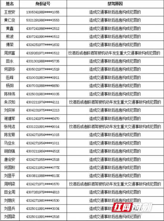 5月20日,湖南省公安厅交警总队联合各市州公安局交警支队,曝光2019年1-4月份以来157人终生禁驾人员名单,并列入黑名单实施动态监管。一旦发现其中有人再次申领机动车驾驶证,系统将会自动锁定不予办理相关业务。