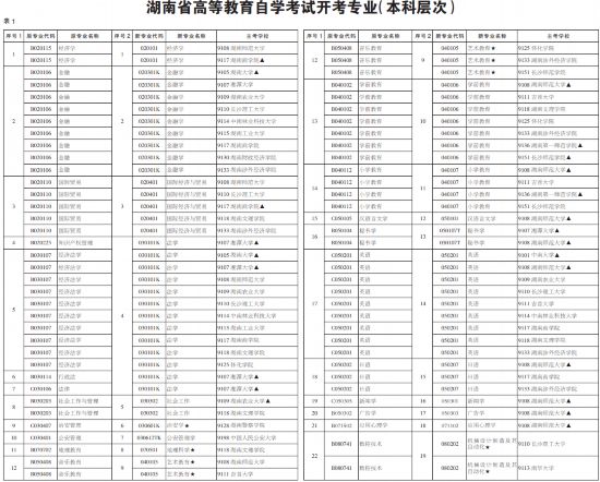 表1湖南省高等教育自学考试开考专业(本科层次)