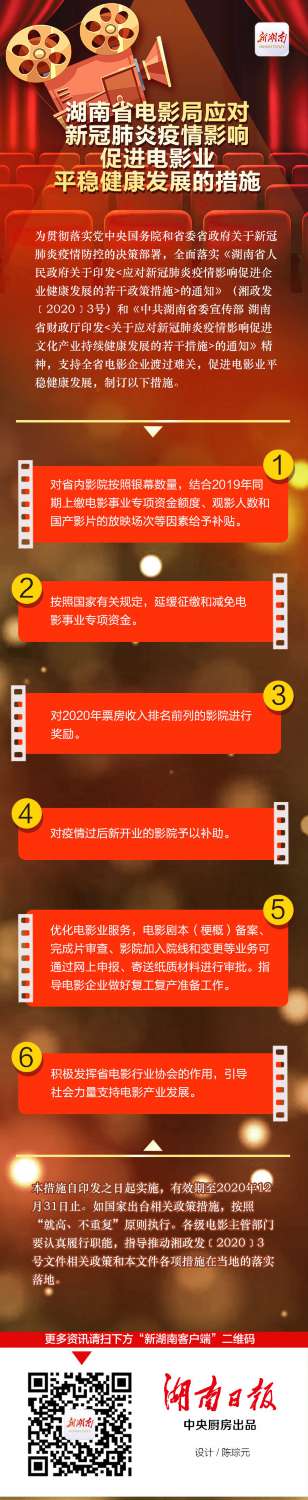 面对新冠肺炎疫情给电影业带来的巨大影响,湖南打出政策组合拳,力助电影业尽快走出困境,推动平稳健康发展。