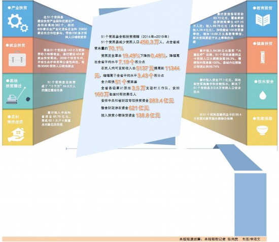 脱贫攻坚以来,我省以51个贫困县为主阵地,探索出了一系列可复制可推广的“湖南经验”,打造了一批精准脱贫的“村级样本”。2014年至2019年,全省51个贫困县共减少贫困人口456.3万人,占全省减贫总量的70.1% ;贫困发生率由19.49%下降到0.48%,农民人均可支配收入由5137元提高到11344元。