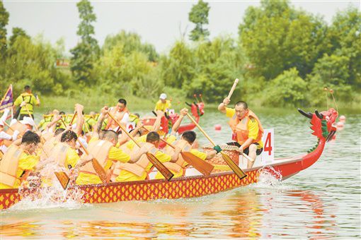 “嘿嚯,嘿嚯……”湖面上,鼓声、呐喊声此起彼伏,一条条龙舟如离弦之箭破开水面,飞快冲向终点。