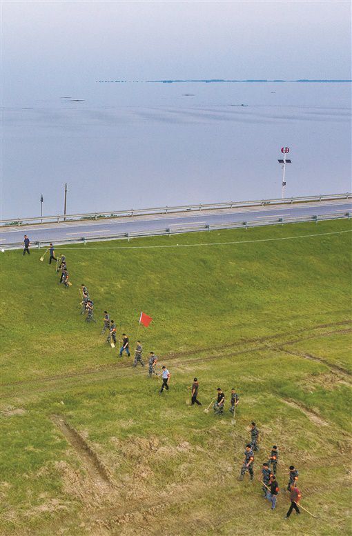 7月14日,君山区洞庭湖大堤许市镇丁字堤段,巡防人员进行拉网式排查。该区有一线防洪大堤119公里,连日来,2700多名工作人员分成62个防汛值守连,24小时巡堤查险,确保大堤安全。湖南日报记者 唐俊 通讯员 邓亚杰 摄影报道