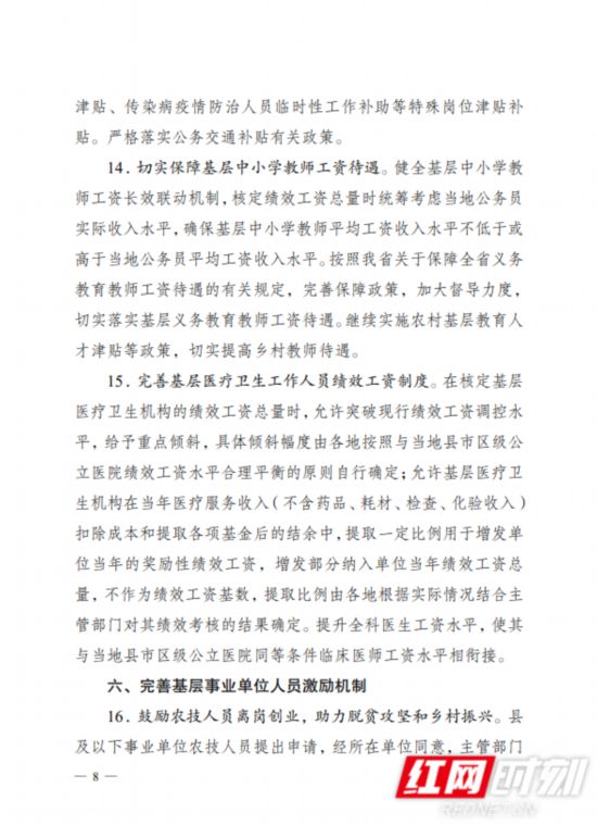 近日,湖南省人力资源和社会保障厅印发《关于加强基层事业单位人事人才工作的若干意见》(以下简称《意见》),从落实基层事业单位人员工资福利待遇、完善激励机制等六大方面制定18条意见,加强基层事业单位人事人才工作,拓展基层事业单位人员职业空间,强化待遇保障,引导人才服务基层、扎根基层。《意见》自2020年8月1日起施行,有效期5年。