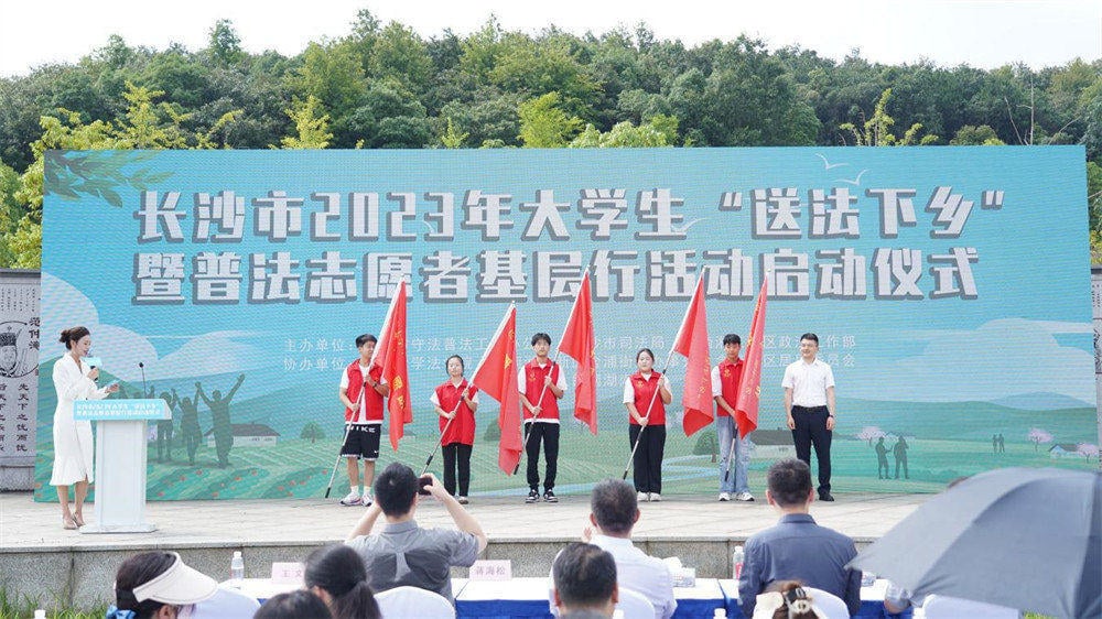 启动仪式上,湖南湘江新区政法工作部部务委员赵赢致欢迎辞,长沙市司法局普法与依法治理处处长王文为大学生“送法下乡”志愿队代表授旗,长沙市司法局党组成员、副局长王剑讲话并宣布活动启动。