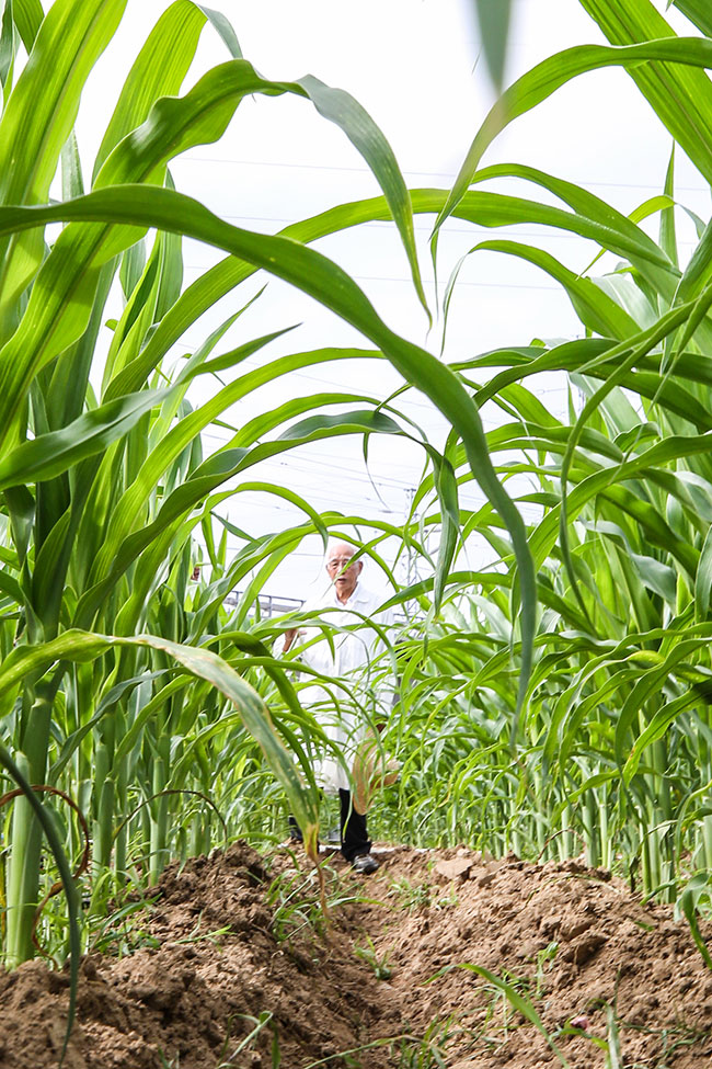 玉米育种专家程相文在海南三亚南繁科研育种基地观察玉米生长情况(2022年12月15日摄)。新华社记者 张丽芸 摄