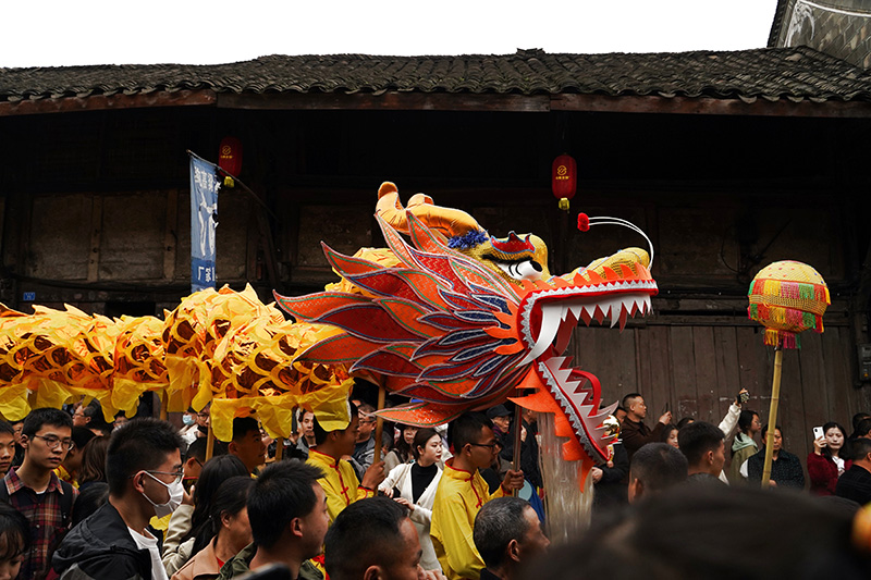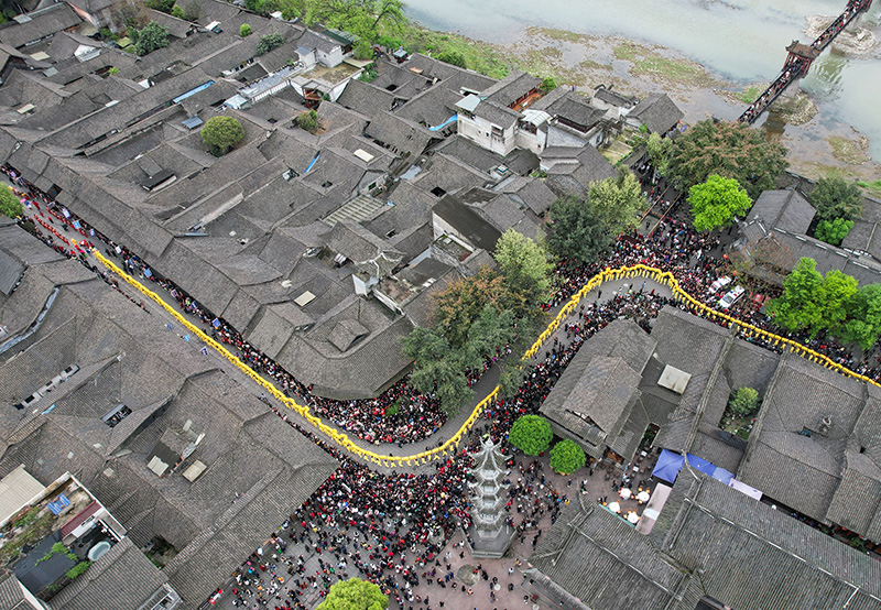当日,崇州元通清明春台会在四川成都崇州市元通古镇拉开帷幕。由269人手举269截龙身汇聚成的“汇江老龙”,在古街上巡游。