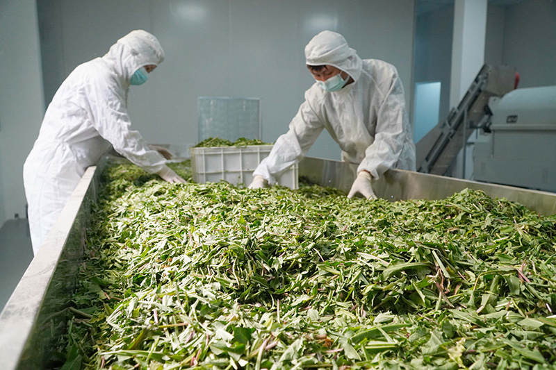 4月11日,在山东省单县黄岗镇的一家蒲公英加工企业,工作人员对刚收获的蒲公英进行加工处理。