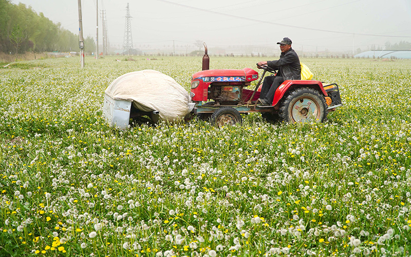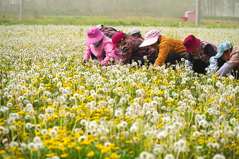 4月11日,在山东省单县龙王庙镇,村民在蒲公英种植田收割蒲公英。