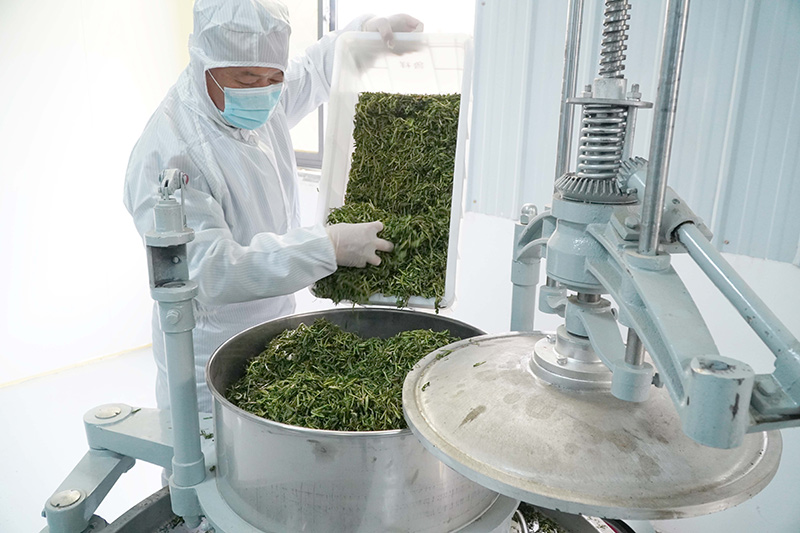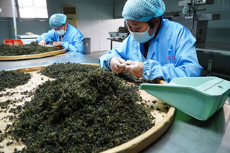 4月11日,在山东省单县黄岗镇的一家蒲公英加工企业,工作人员在筛选蒲公英茶。
