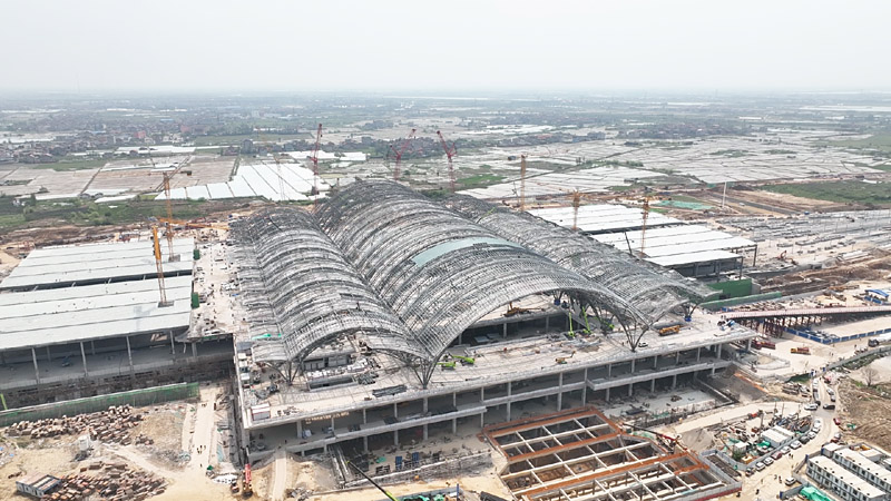 4月12日拍摄的在建的南昌东站站房工程外景(无人机照片)。
