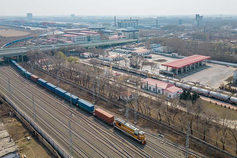 4月16日,国产品牌商品汽车中欧班列驶出哈尔滨国际集装箱中心站(无人机照片)。