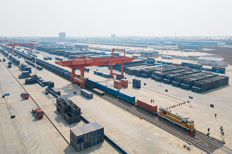 4月16日,在哈尔滨国际集装箱中心站,国产品牌商品汽车中欧班列等待发车。