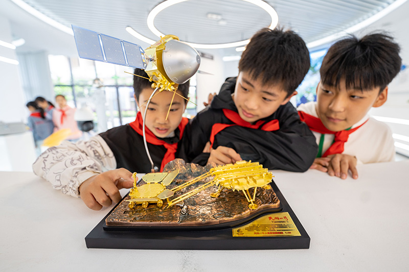 4月21日,在安徽省合肥市肥东县长临河科创小镇空间遥感技术中心,小学生在观看“天问一号”火星探测器模型。