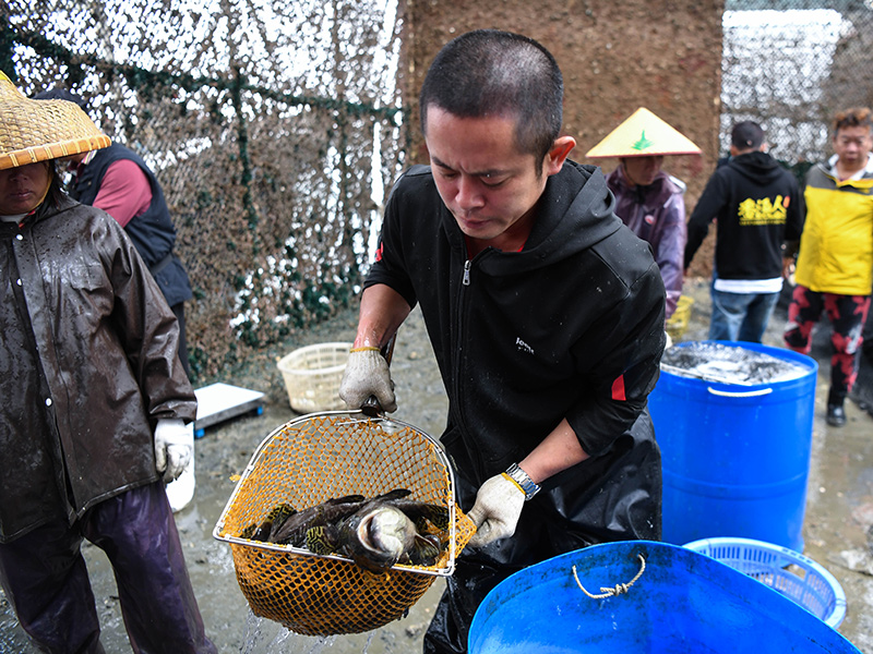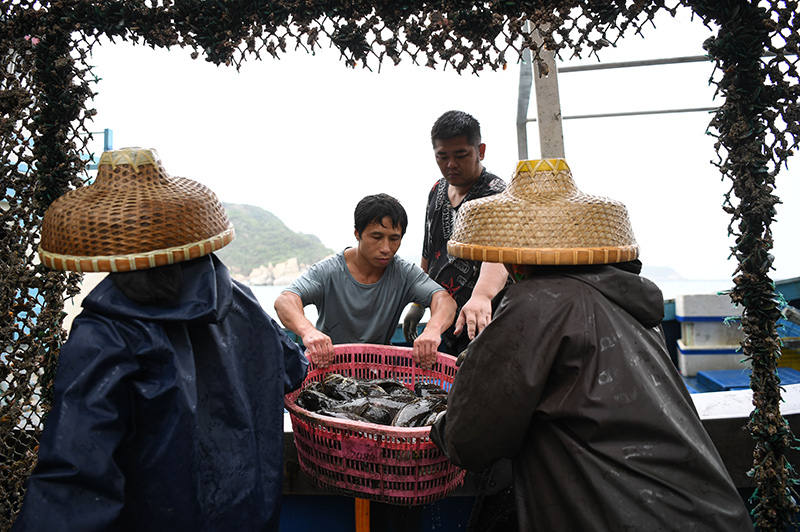 在广东珠海万山海域,中国首台半潜式波浪能养殖旅游平台“澎湖号”上,工作人员装载刚捕捞的石斑鱼(4月25日摄)。