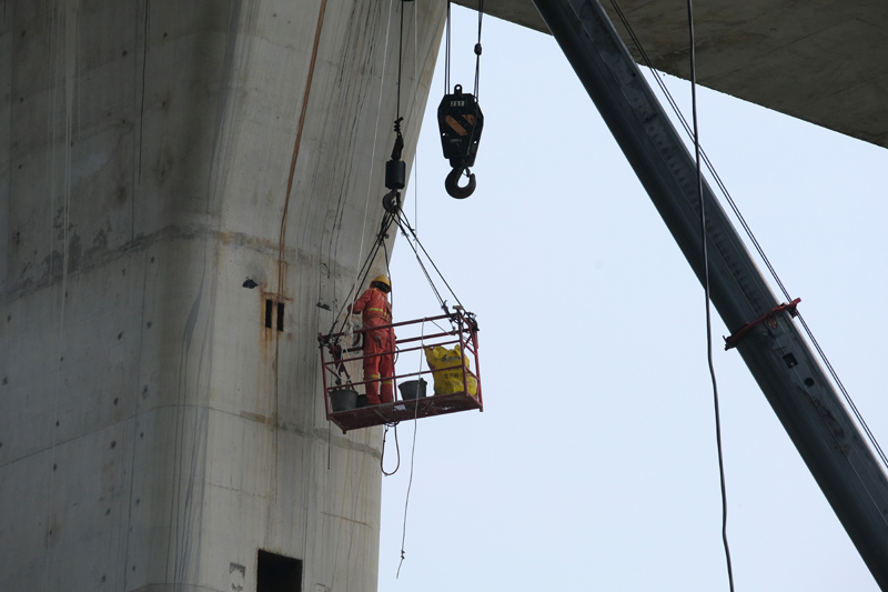 工人在广西龙门大桥项目建设工地施工(5月1日摄)。