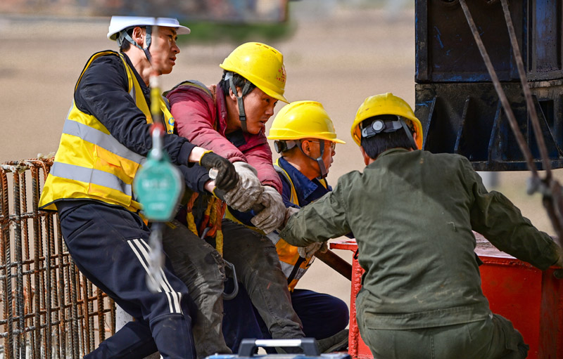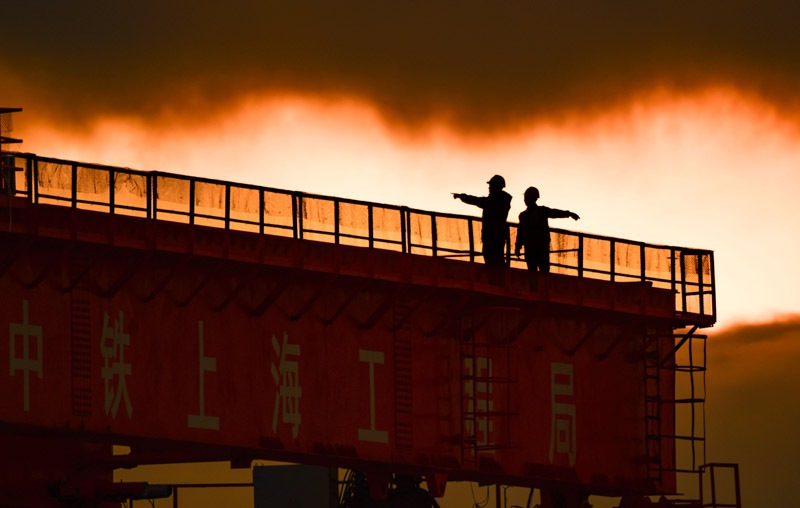 5月5日,建设者在包银高铁跨万甘铁路特大桥箱梁架设施工现场作业。