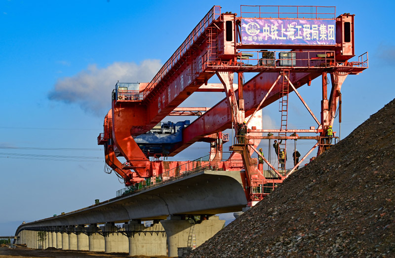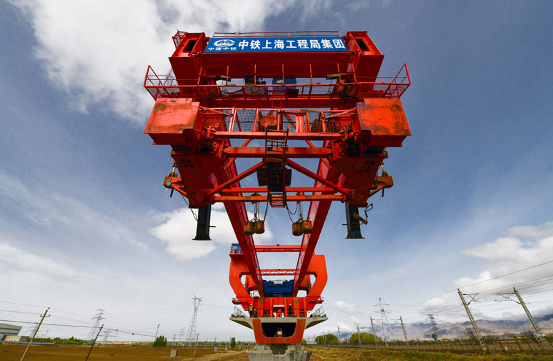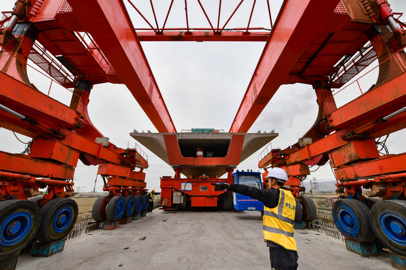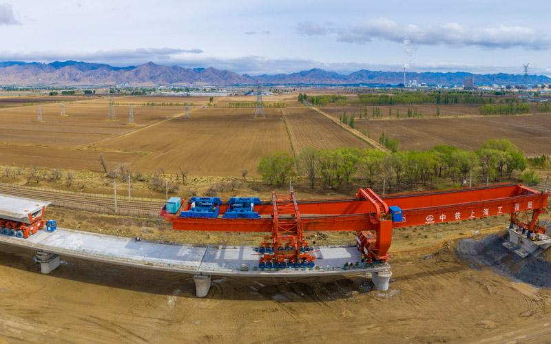 5月5日拍摄的包银高铁跨万甘铁路特大桥箱梁架设施工现场。