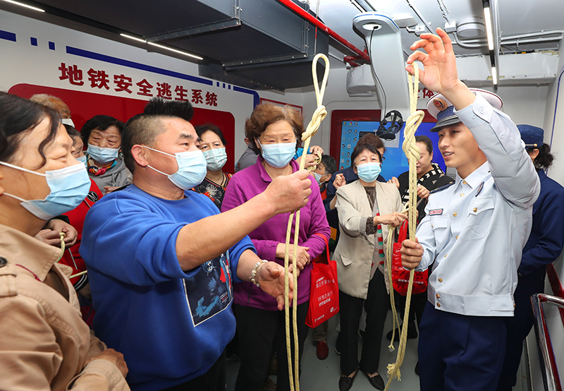5月11日,长宁区消防救援支队的消防员教社区居民打逃生绳结。