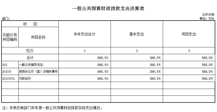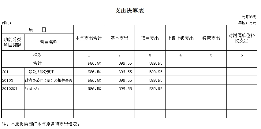 2016年全年总支出为986.5万元,其中:基本支出396.5万元,占总支出40%的,项目支出590万元占总支出的60%。
