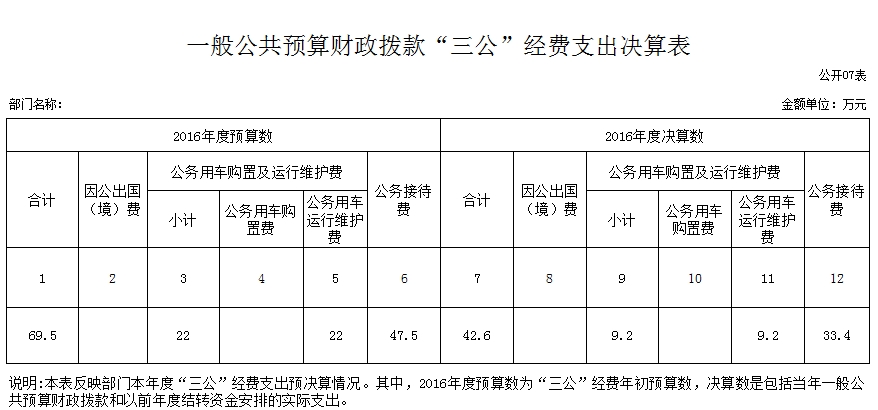 2016“三公”经费总支出为42.6万元,2015年三公经费总支出为54.67万元。对比2015年,2016年“三公”经费减少支出12.07万元,主要在公务用车运行及公务接待费用上减少开支。