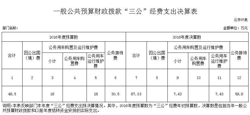 我单位2016年“三公”经费预算安排46.5万元,其中:公务接待费30.5万元,公务用车运行维护费16万元。2016年“三公”实际支出为37.3万元,其中:公务接待费29.9万元,公务用车运行维护费7.4万元。