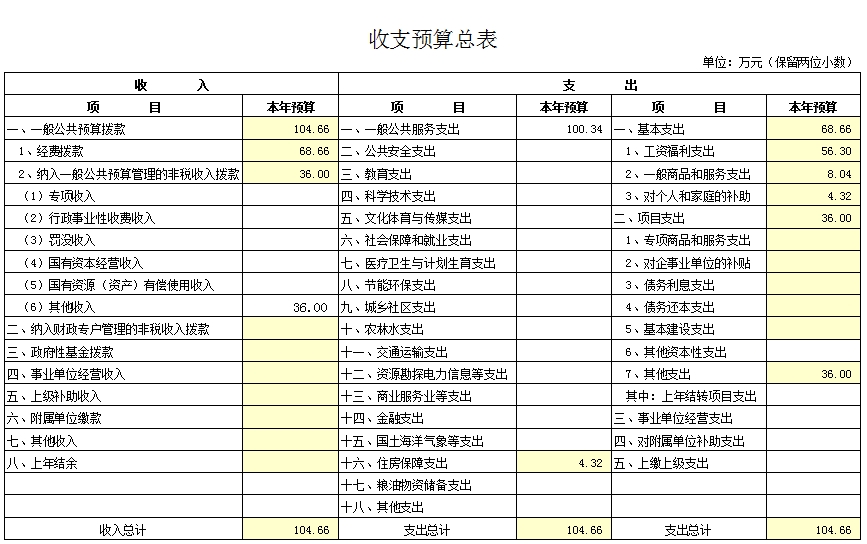 预算总收入104.66万元,其中:经费拨款68.66万元;纳入预算管理的非税收入拨款36万元。