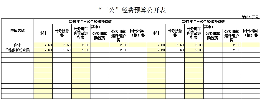 2017年“三公”经费预算数为 7.6 万元,其中,公务接待费 5.6 万元,公务用车购置及运行费 2 万元(其中,公务用车购置费 0万元,公务用车运行费 2万元),因公出国(境)费 0万元。2017年“三公”经费预算与2016年持平。