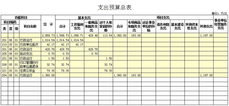 预算总支出2959.73万元,其中:基本支出1599.73万元(工资福利支出1056.71万元、一般商品和服务支出429.48万元、对个人和家庭的补助支出113.54万元);项目支出163万元。非税执收成本1197万元。