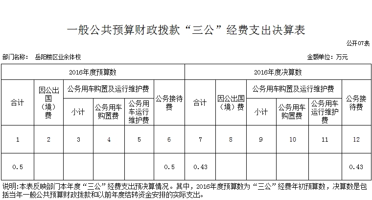 2016年“三公”经费支出合计0.43万元,比公开的部门预算数减少0.07万元,系开展体育活动、体育训练工作餐所致,公务接待共23批230人次。没有因公出国(境)费。