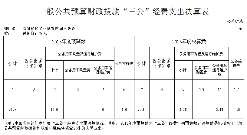 2016年“三公”经费支出合计8.33万元,比公开的部门预算数减少6.27万元,招待费主要用之于公共文化示范区创建接待费、欢乐潇湘活动演出招待费、广场、社区文化活动及大型体育比赛活动。分项为:接待62批次,1122人,公务接待费5.18万元,,比公开的部门预算数减少3.42万元,公务用车开支为3.15万元,比公开的部门预算数减少2.85万元,没有发生因公出国(境)费。