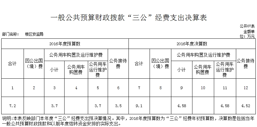 2016 年度“三公”经费财政拨款支出预算为7.2万元,支出决算为9.1万元,完成预算的126%,其中:公务用车运行维护费支出决算为4.58万元,完成预算的123%;公务接待费支出决算为4.52万元,完成预算的129%。2016年度“三公”经费支出决算数大于预算数。