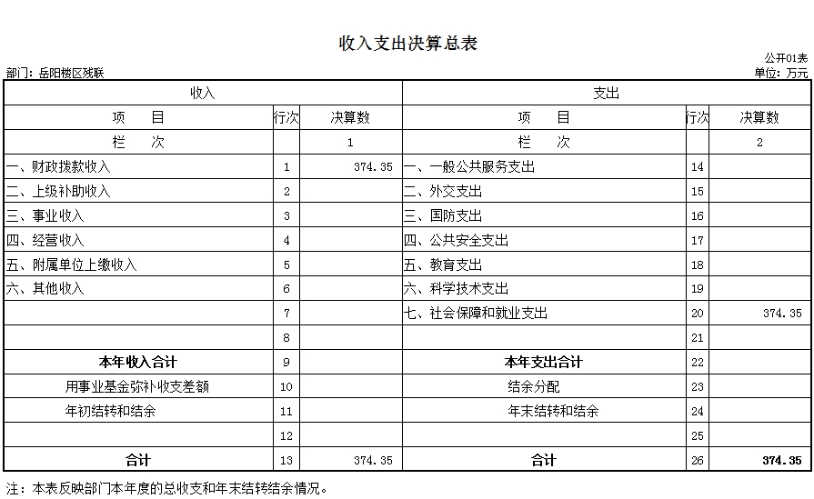 岳阳楼区残联2016年度财政拨款收支总决算374.35万元。与2015年相比,财政拨款收、支总计各增加150.94万元,增加67.56%。