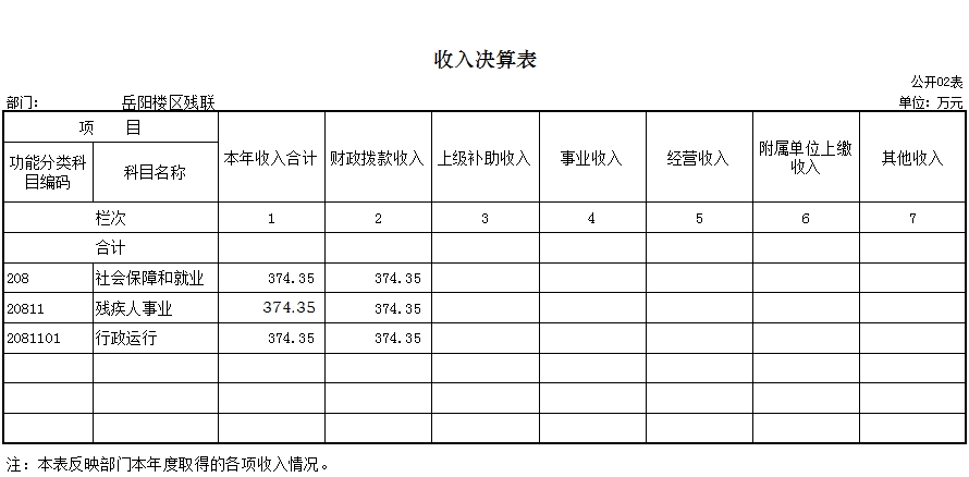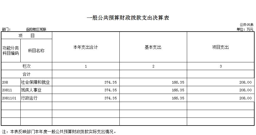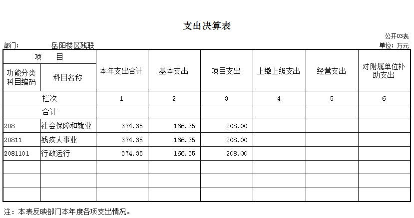 岳阳楼区残联2016年度财政拨款支出年初预算为374.35万元,支出决算为 374.35万元,完成年初预算的100%。