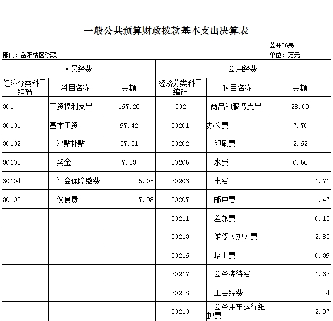 岳阳楼区残联 2016年度财政拨款基本支出167.26万元,其中: