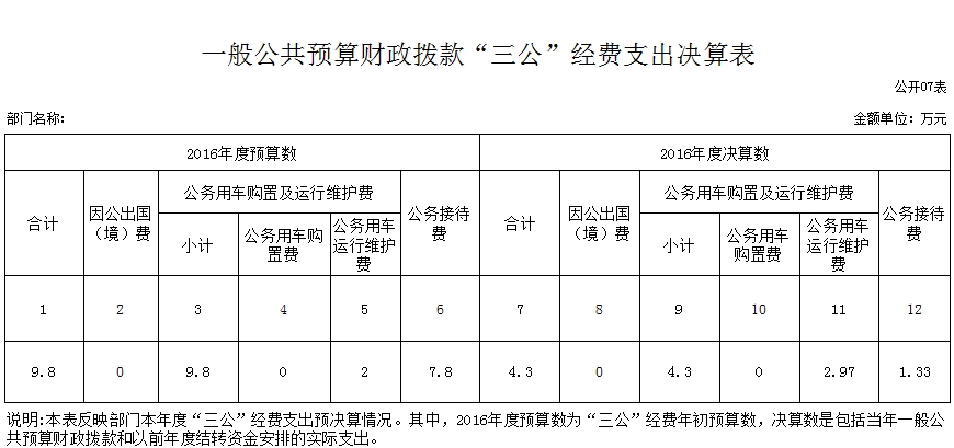 2016年度“三公”经费财政拨款支出决算中,因公出国(境)费支出决算0万元,占0%;公务用车购置及运行费支出决算2.97万元,占69.07%;公务接待费支出决算1.33万元,占30.93%。具体情况如下: