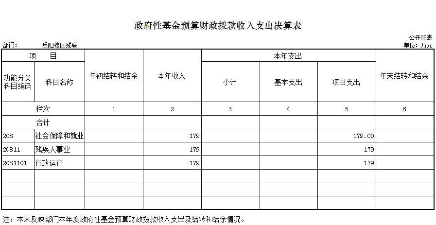 岳阳楼区残联2016年度政府性基金财政拨款收支总决算179万元。2015年此项没有纳入。