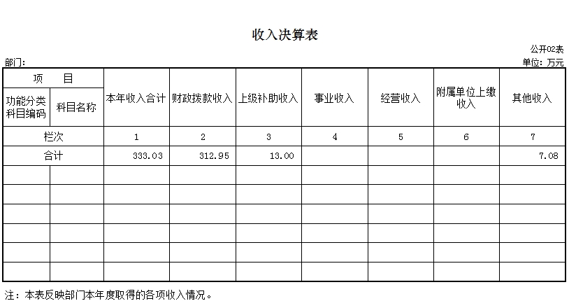 本年度总收入为333.03万元,其中公共财政拨款312.95万元,事业类收入20万元