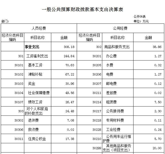 工资福利支出244.84万元。其中:基本工资70.63万元、津贴补贴67.22万元、奖金30.96万元、社会保障缴费49.56万元、绩效工资26.47万元。商品和服务支出38.86万元。其中:办公费1.27万元、水费0.32万元、电费1.27万元、邮电费0.12万元、租赁费7.5万元、差旅费0.02万元、公务接待费2.3万元、专用材料费0.11万元、工会经费0.24万元、公务用车运行维护费5.7万元,其他商品服务支出及项目支出20万元。对个人和家庭的补助24.48万元。其中:退休费7.08万元、救济费0.02万元、住房公积金17.38万元。