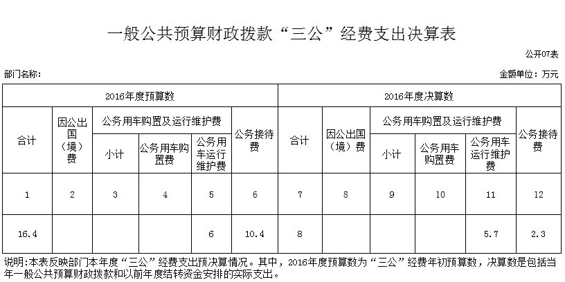 2016年度“三公”经费预算数为16.4万元,实际支出决算数为8万元.其中公务接待费2.3万元,公务用车运行维护费5.7元,三公经费实际使用数比预算数少8.4万元。
