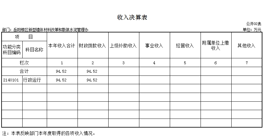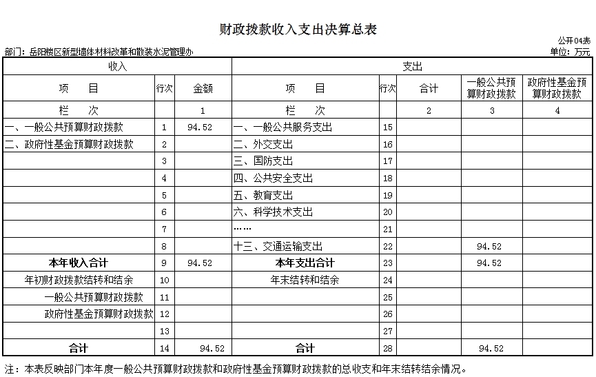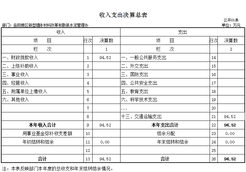 岳阳楼区新型墙体材料改革和散装水泥管理办公室2016年总的收支决算94.52万元,2016年本单位4月份新成立,与2015年无对比性。