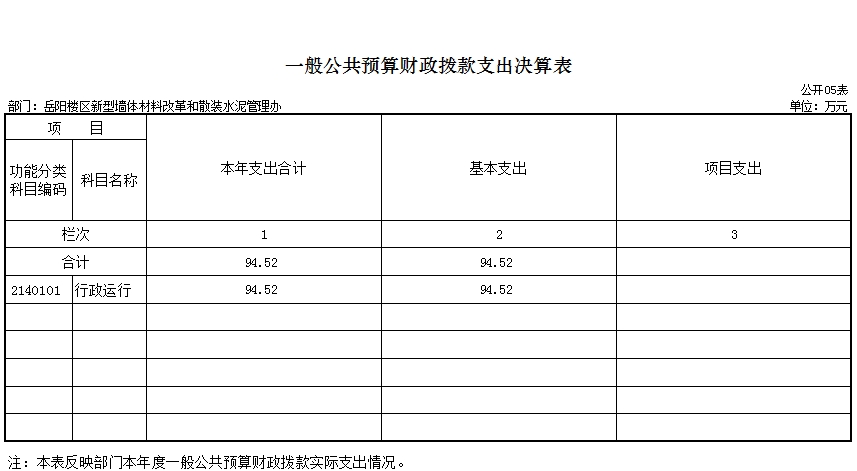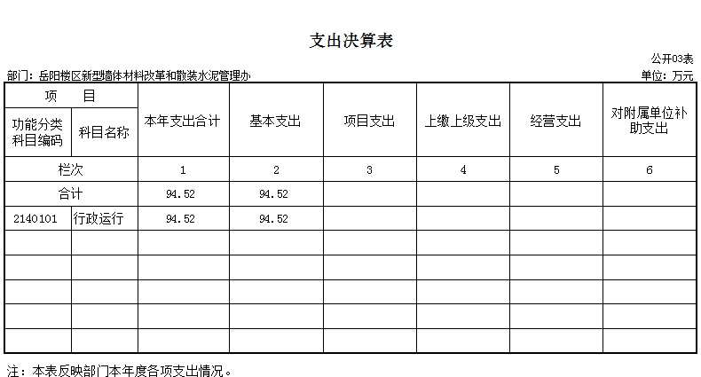 岳阳楼区新型墙体材料改革和散装水泥管理办公室2016年财政拨款支出决算94.52万元,2016年本单位4月份新成立,与2015年无对比性。