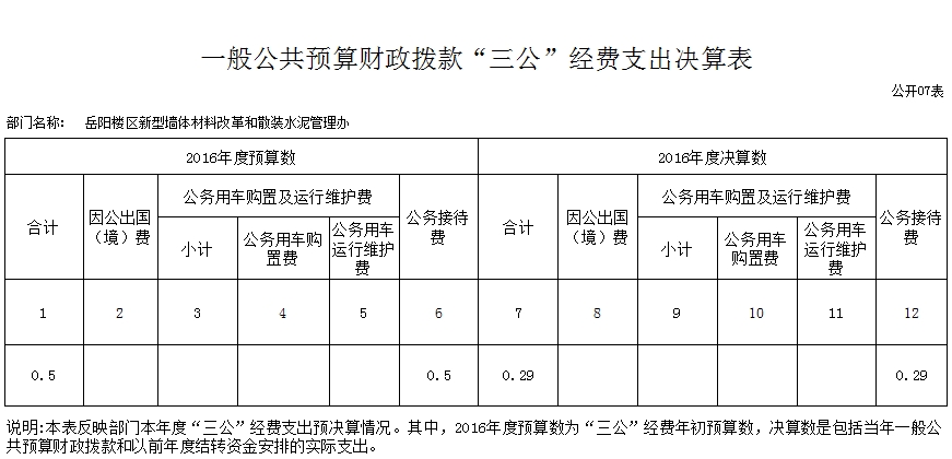 岳阳楼区新型墙体材料改革和散装水泥管理办公室单位无2016年度一般公共预算财政拨款“三公”经费支出决算。