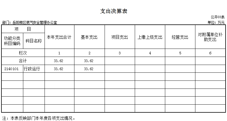 岳阳楼区燃气安全管理办公室2016年财政拨款支出决算33.62万元,2016年本单位4月份新成立,与2015年无对比性。