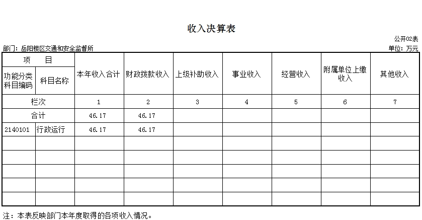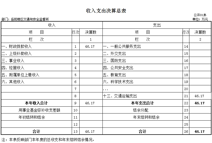 岳阳楼区交通和安全监督所年度收入总计46.17万元,支出总计46.17万元,2016年本单位4月份新成立,与2015年无对比性。
